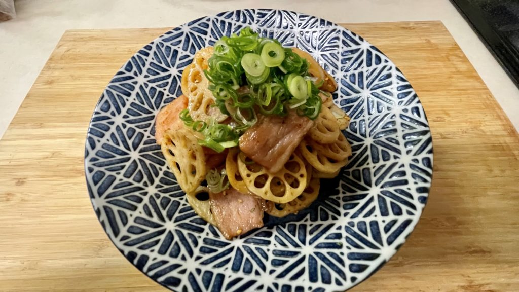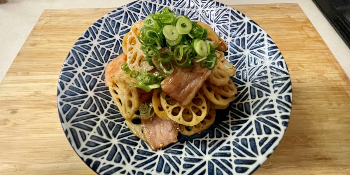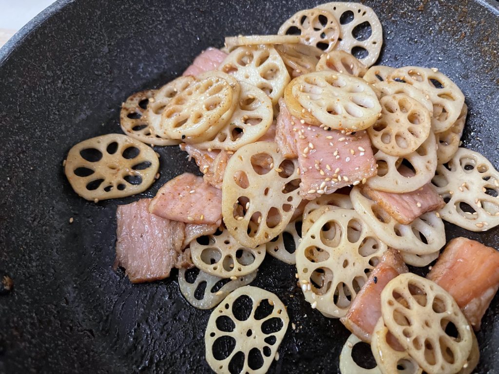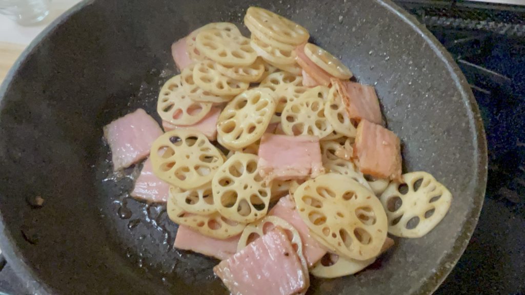 - れんこんに火が入りしんなりしたらベーコンも炒めます。