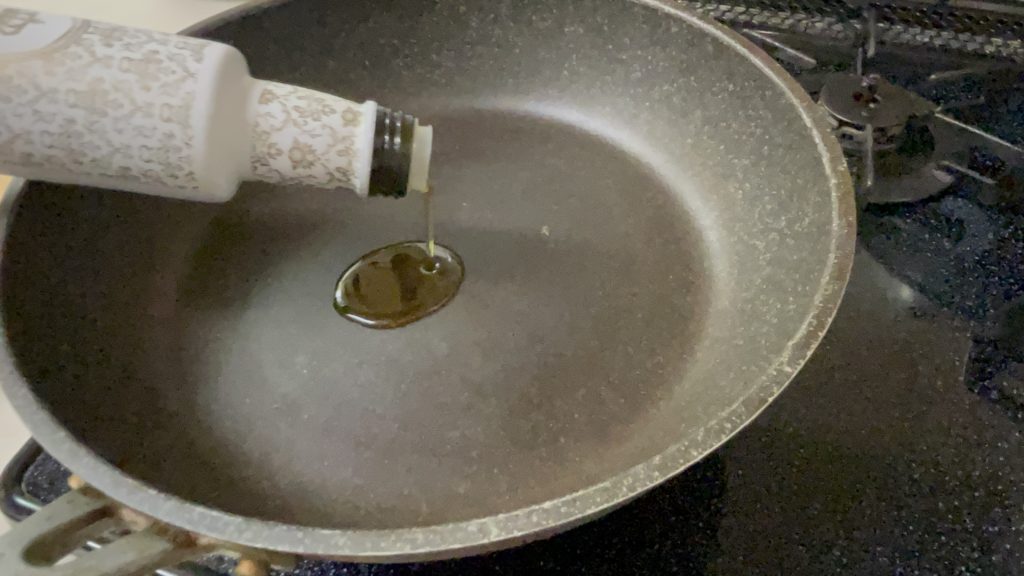 - 熱したフライパンにオリーブオイルをひきます。