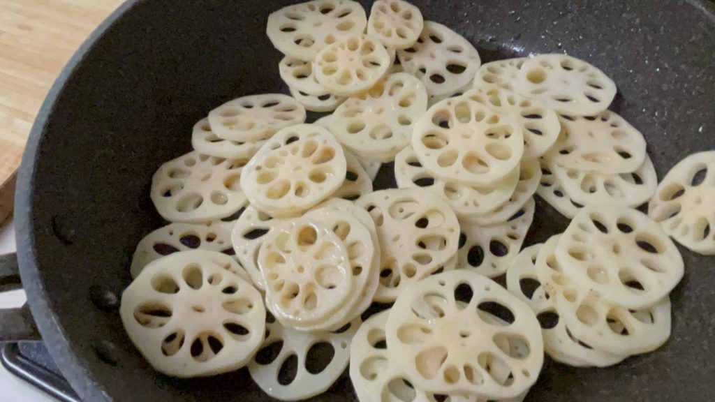 - れんこんを炒めます。