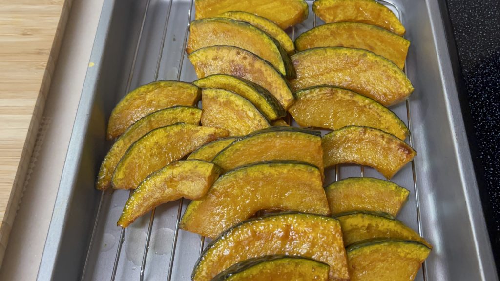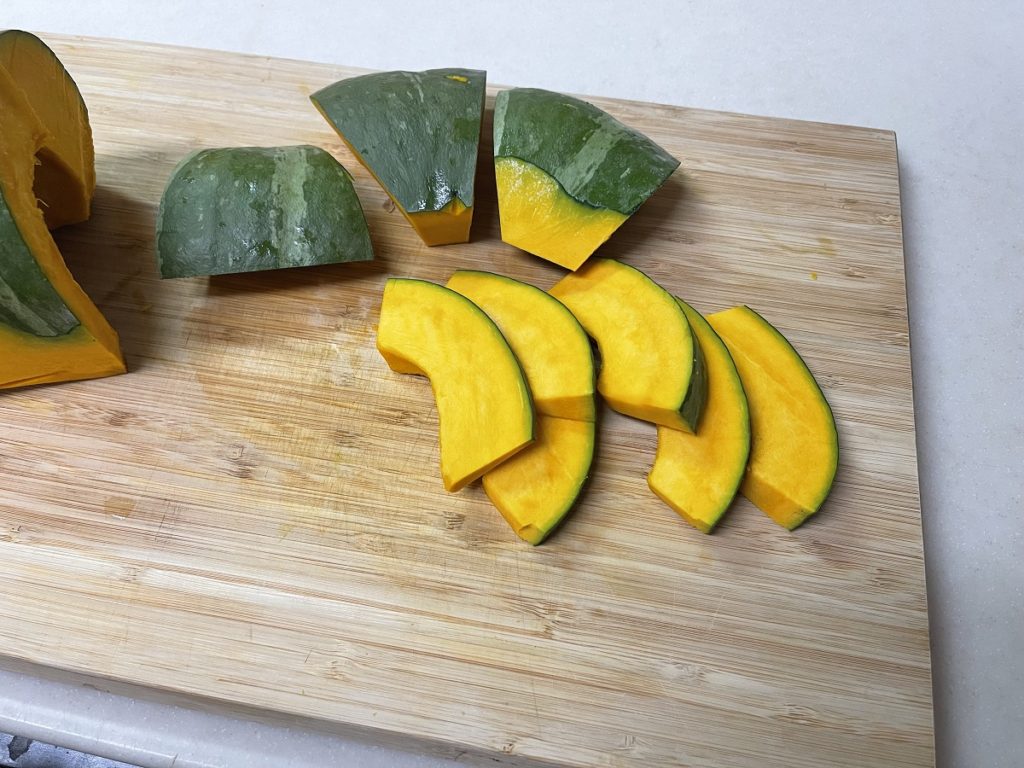 - 南瓜は半分に切り、スプーンで種を取り除き、切りやすい大きさに柵をとってから約1.5〜2㎝にスライスします。