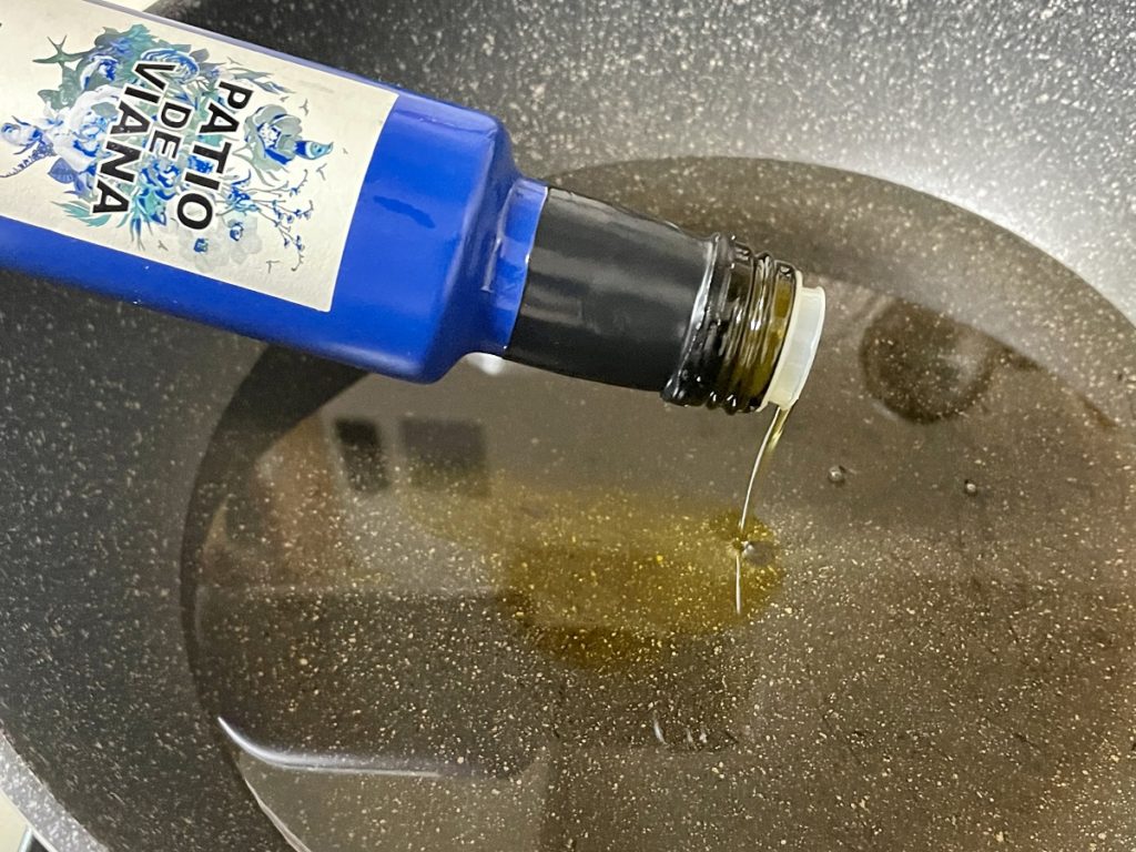 - フライパンにサラダ油2:オリーブオイル1の割合で合わせたものをひき、火にかけます。