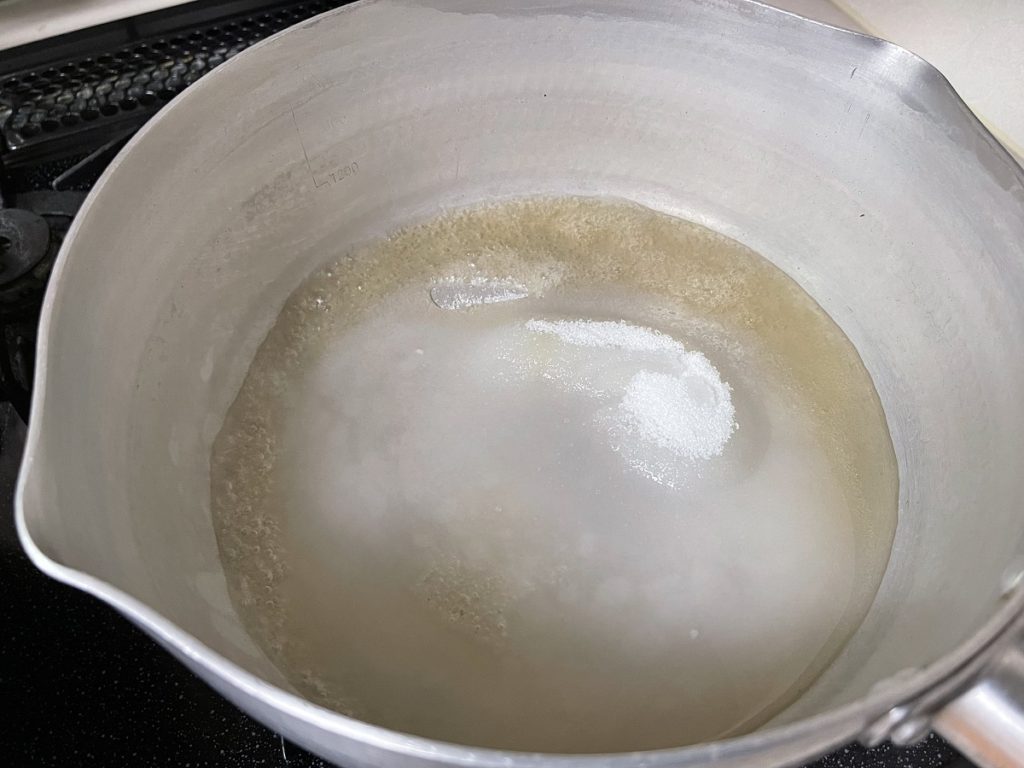 - 鍋で蜜を合わせて中火にかけます。ひと煮立ちしたら約30秒煮詰めます。