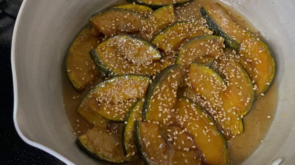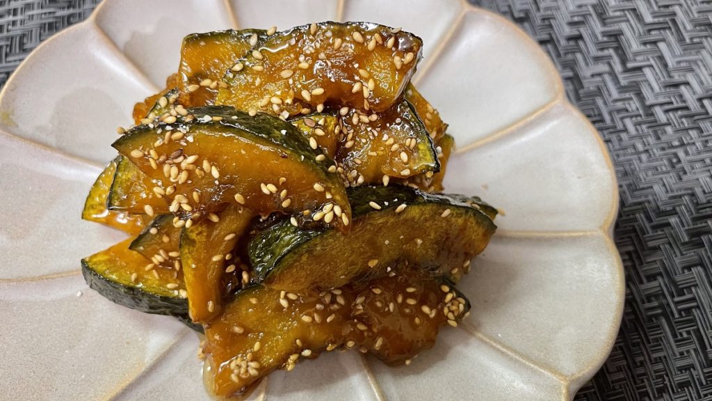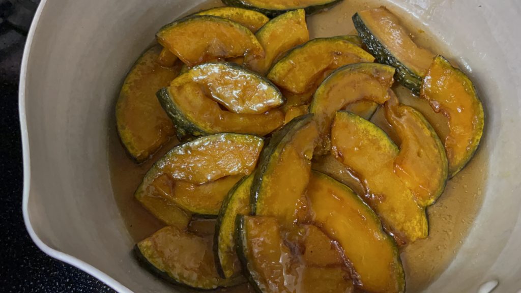 - 弱火にして素揚げしたかぼちゃを入れて全体に絡ませたら火を止めます。