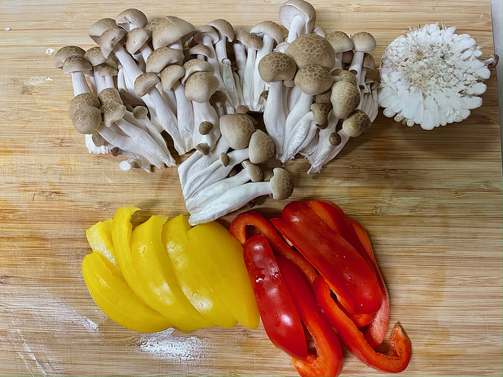 2. しめじは石づきを切り、3~4本の束にします。 パプリカは種を取り8等分に切ります。