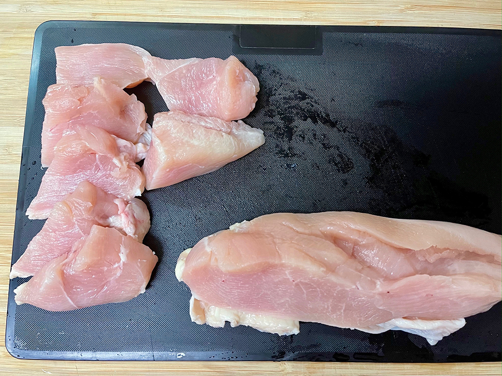 3. 鶏胸肉は縦半分に切り、薄めのそぎ切りにします。