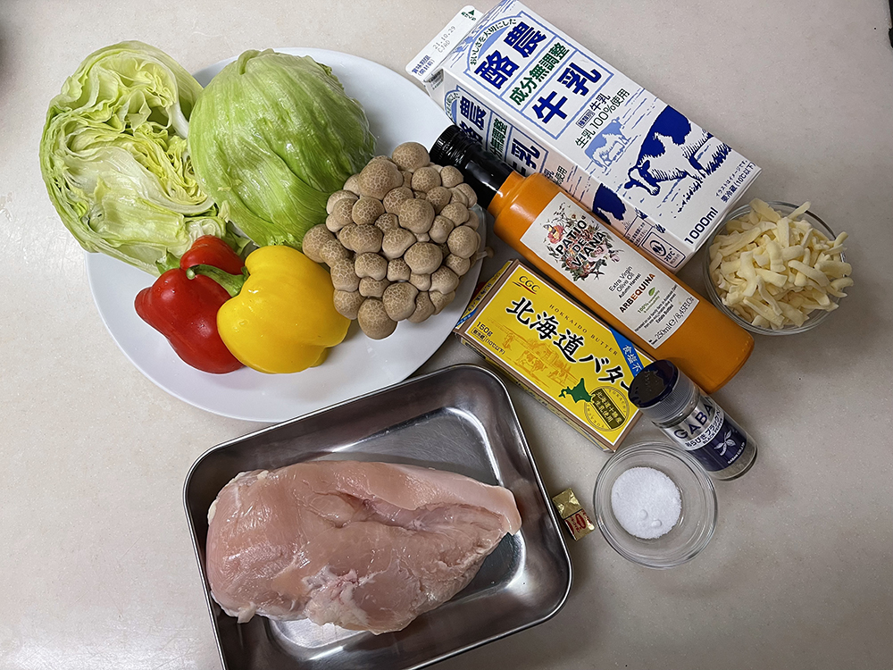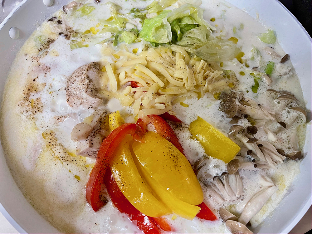 6. 沸騰したら鶏胸肉、しめじ、パプリカを入れ全体に火を入れます。