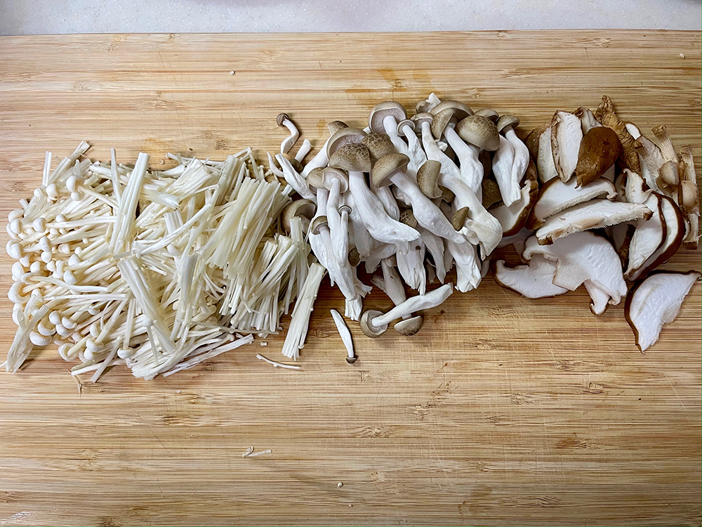 - しめじは石づきを外し、1本ずつばらします。椎茸は、やや厚めにスライス。えのき茸も石づきを切り3等分にカットします。えのき茸のくっついている部分は手でばらします。