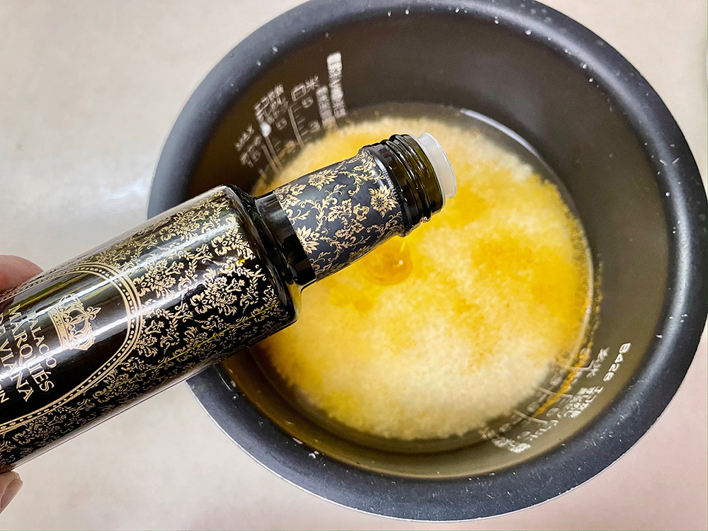 - 炊飯器に研いだ米とご飯出汁を入れ、オリーブオイルを大さじ1入れます。
