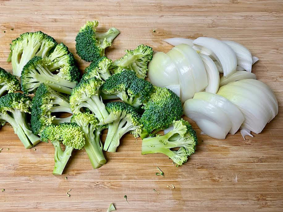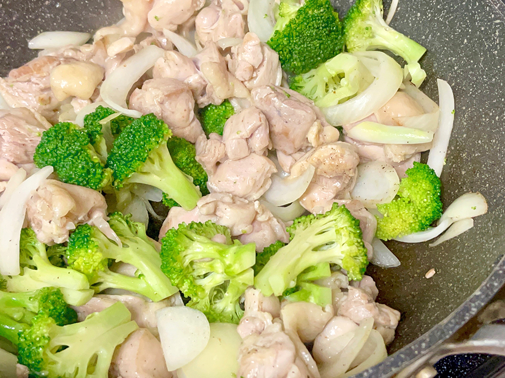 鶏もも肉の色が変わったらブロッコリーと玉ねぎを入れて、塩胡椒で下味をつけて火を通します。