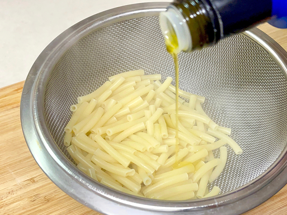 - マカロニを湯がいてオリーブオイルを絡ませます。