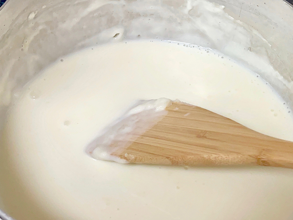 - 全体が固まりまとまったところで、牛乳 600mlを少しずつ入れます。