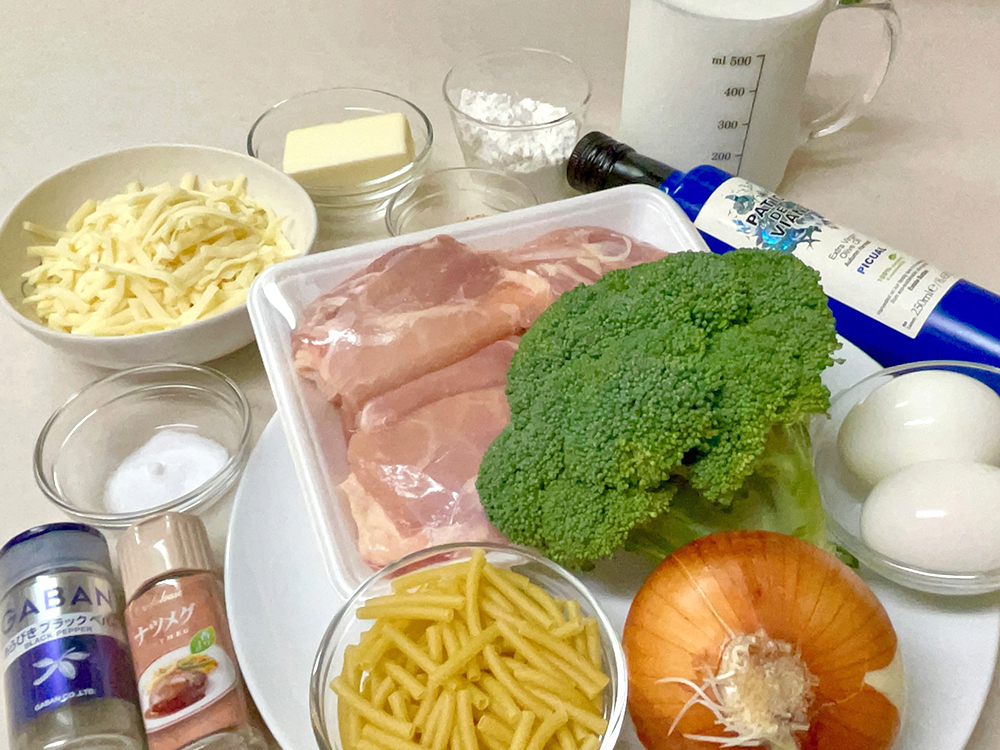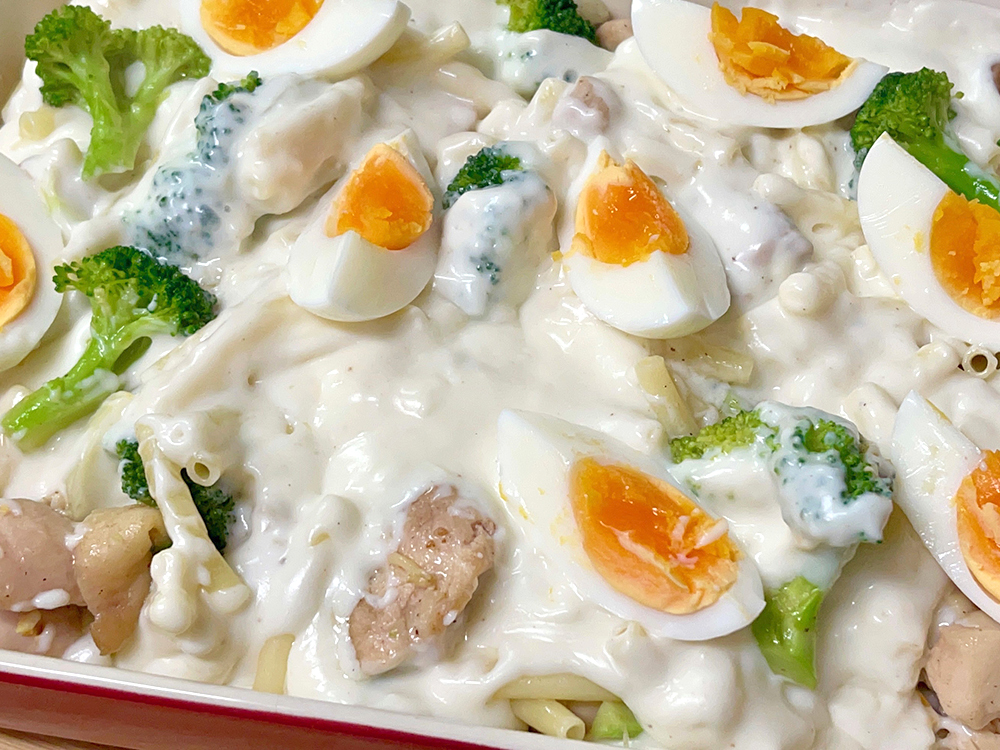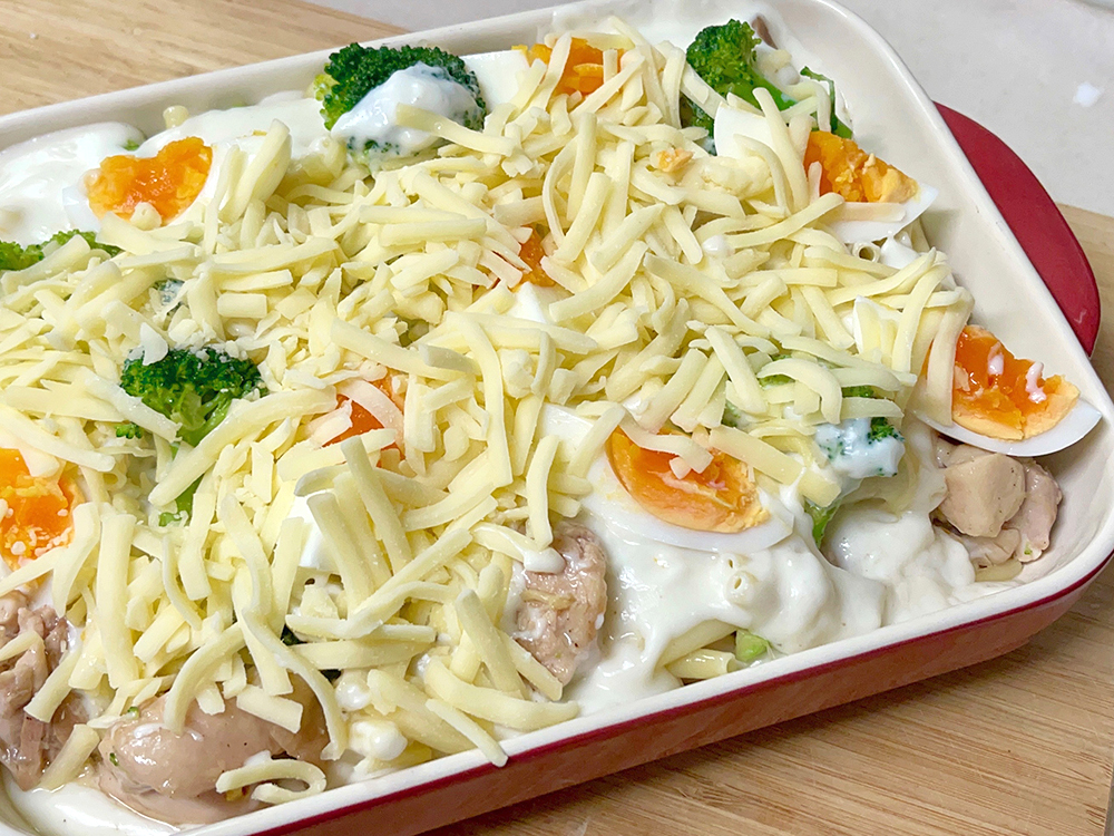 - 具材とマカロニを器に盛り付け、ホワイトソースを全体にまんべんなくかけます。