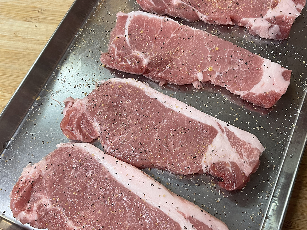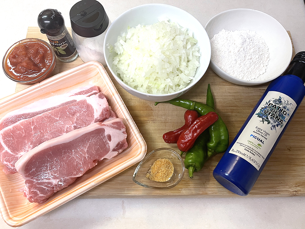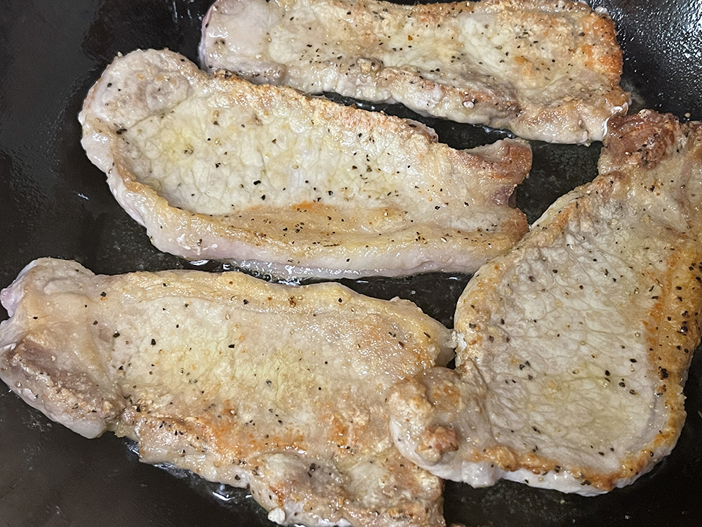 - 豚ロースの表面に満遍なく塩胡椒を振る。小麦粉をつける。