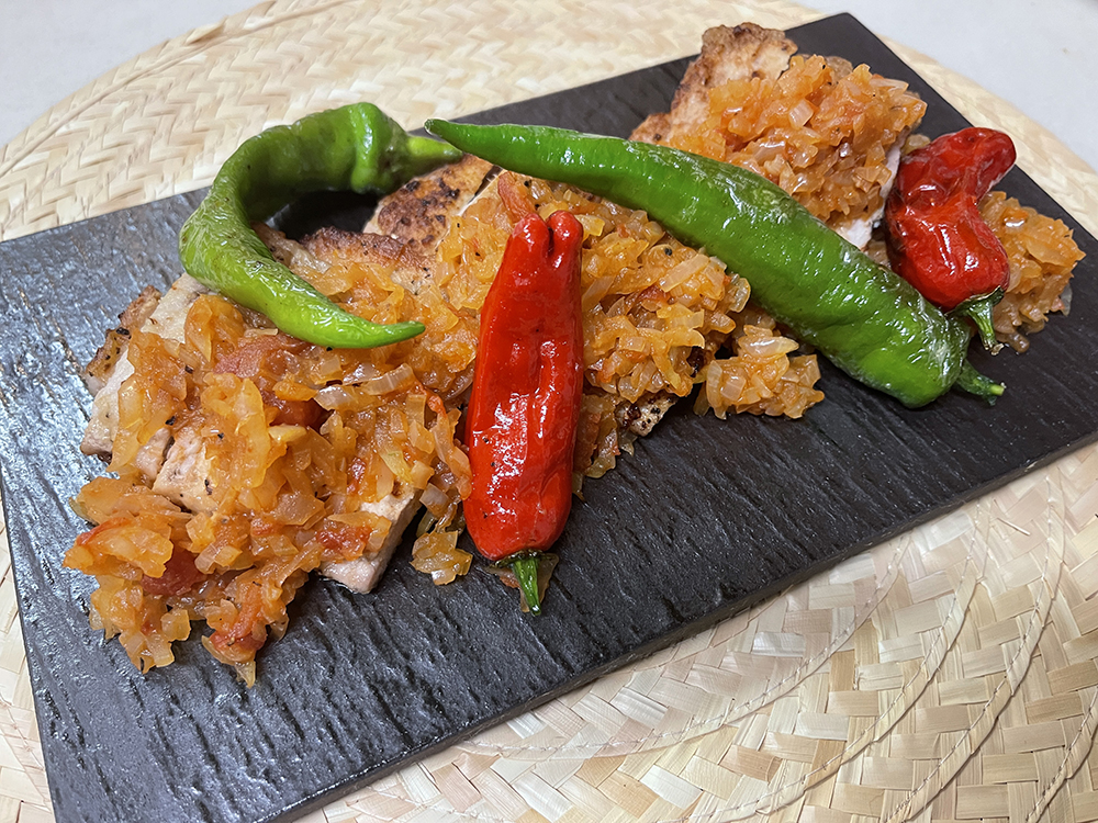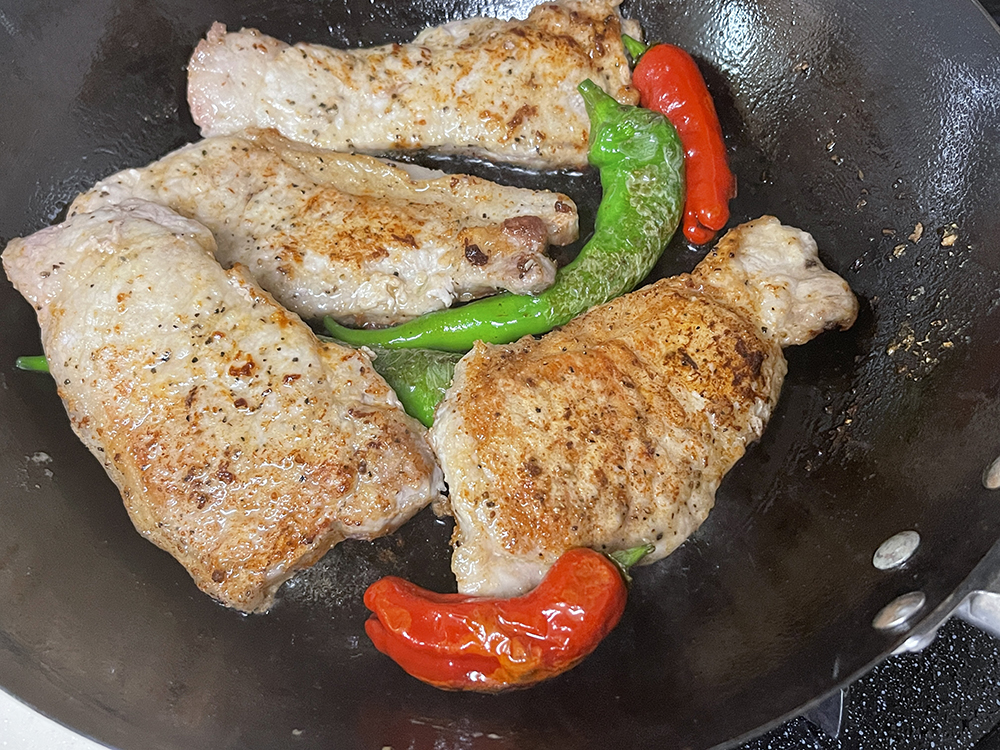 - 途中万願寺とうがらし、赤とうがらしも一緒に焼く。