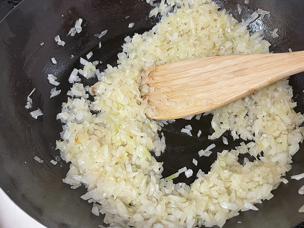 - 別のフライパンで、みじん切りにした玉ねぎを飴色になるまでしっかり炒めます。辛味をなくし、甘みを出すためです。
