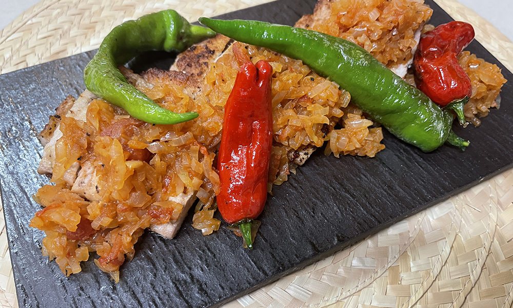 - 途中万願寺とうがらし、赤とうがらしも一緒に焼く。