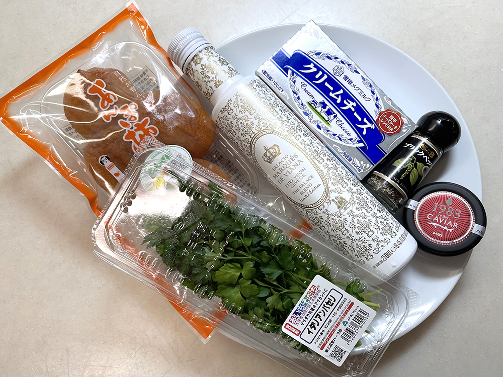 - ブラックペッパーを散らし、キャビア、イタリアンパセリをあしらいオリーブオイルを上から掛けます。