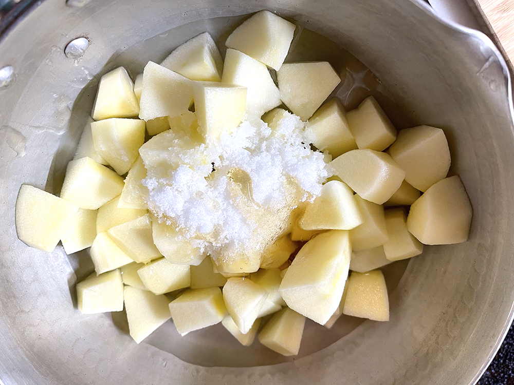 - 鍋に水、蜂蜜、砂糖を入れ、中火にかけます。