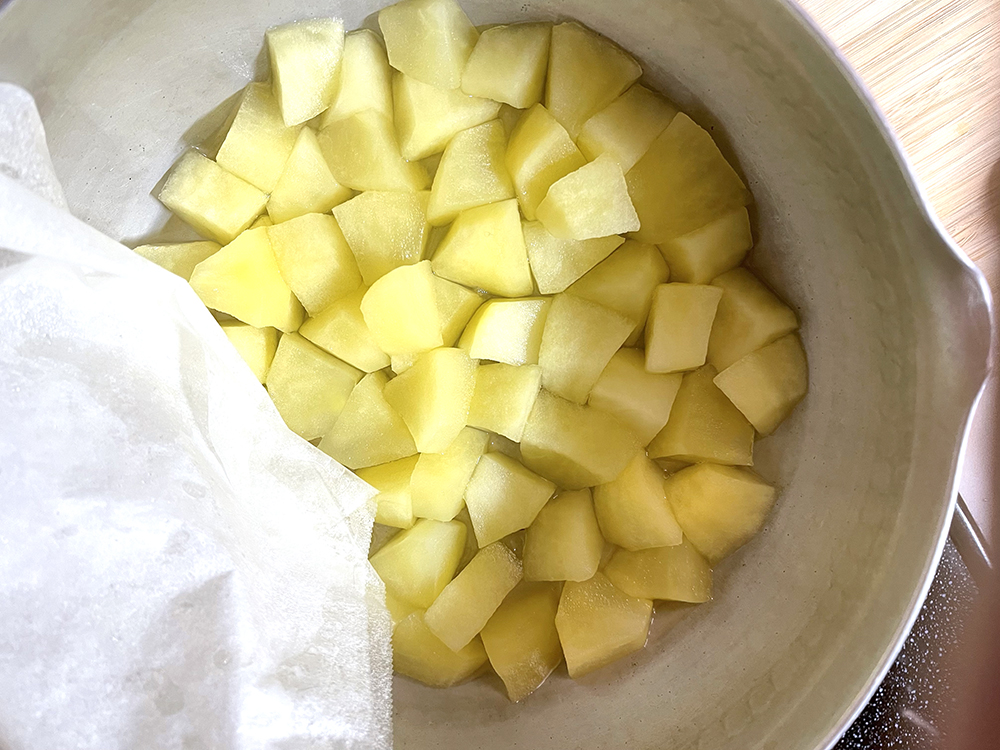 水を切り、林檎を鍋に入れます。