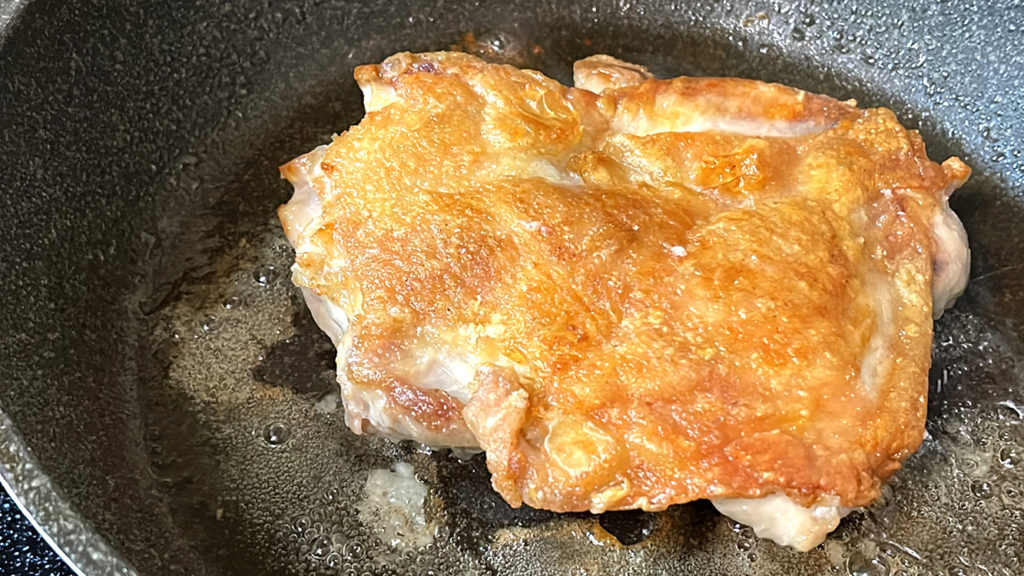 4. こんがり狐色になるまで焼きます。 ポイント:鶏肉が厚い場合は鶏肉の厚みを均一にします。そうすることで肉全体に均等に火が入り早く焼けます