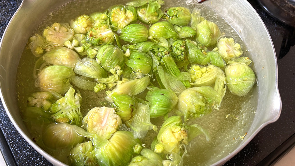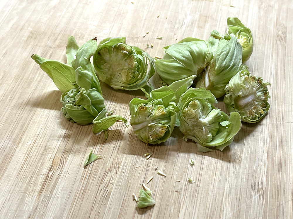 5. 蕗の薹の外側の皮を剥き、軸の黒い部分を切りおとし、半分に切ります。
