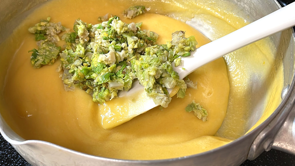 8. 白味噌 300g・酒 大さじ4・砂糖 30g・卵黄2個を鍋に入れ、良く混ぜ合わせます。 弱火にかけ、鍋底があたらないように混ぜながら火を入れていきます。 とろみがついてきたら、刻んだ蕗の薹を入れ、さらにモッタリとするまで火を入れれば完成です。
