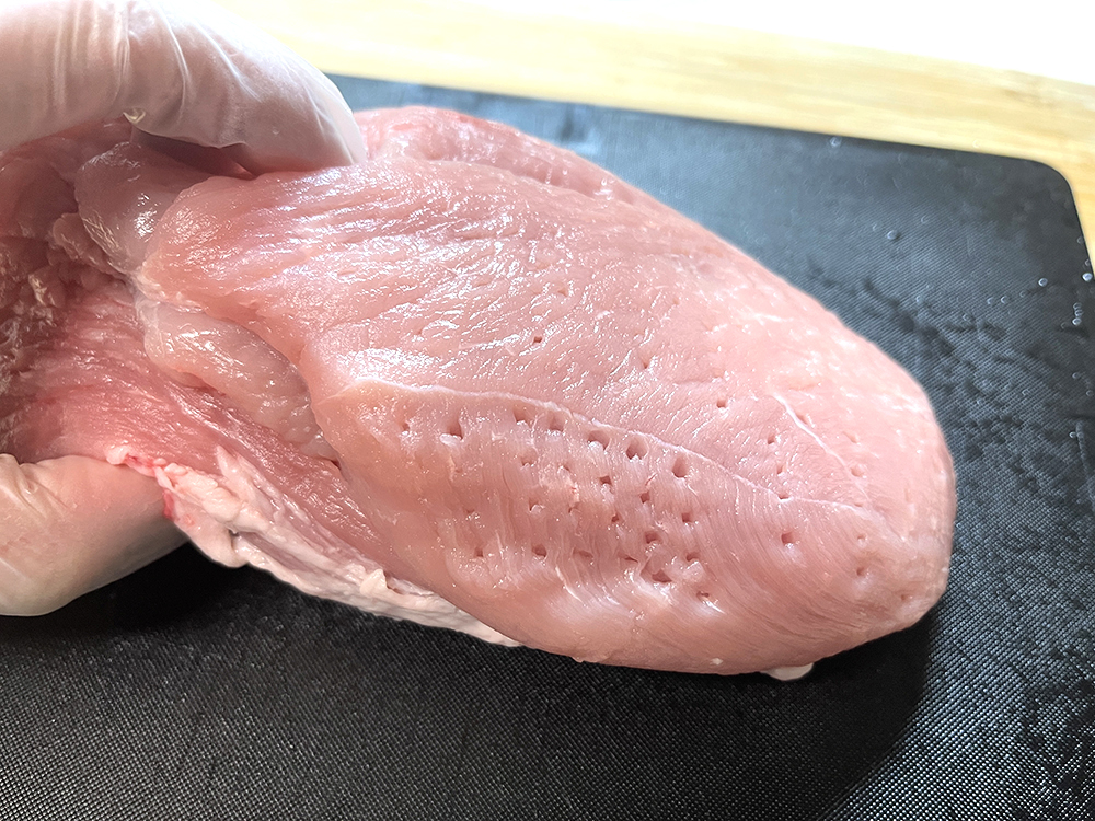 - 豚肉にフォークで穴を開けます。
