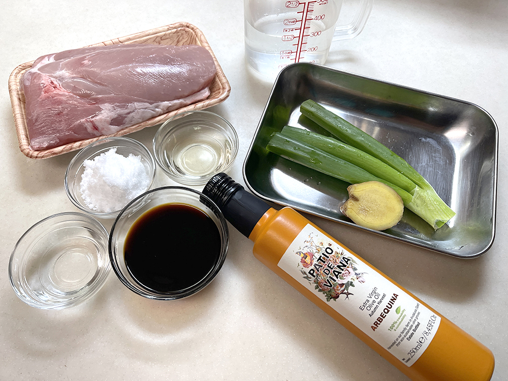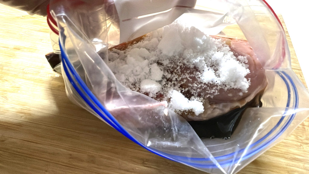 - チャック付きの袋に砂糖30g・酒30g・みりん30g・濃口醤油60gを入れ、ネギと生姜も入れます。