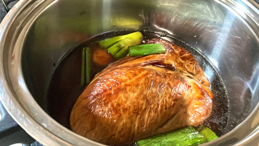 - 圧力鍋に水と肉の漬け汁を入れ、火にかけます。