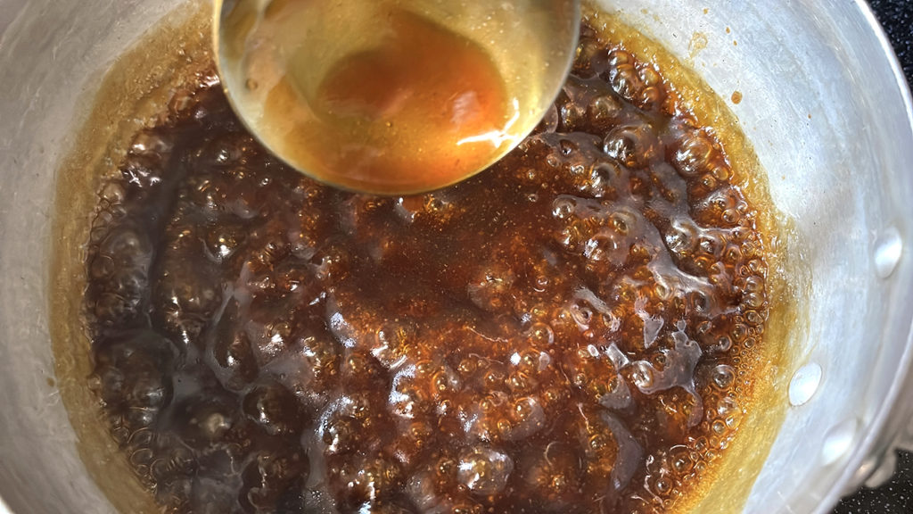 - 煮汁を鍋に入れ、水溶き片栗粉でとろみをつけます。