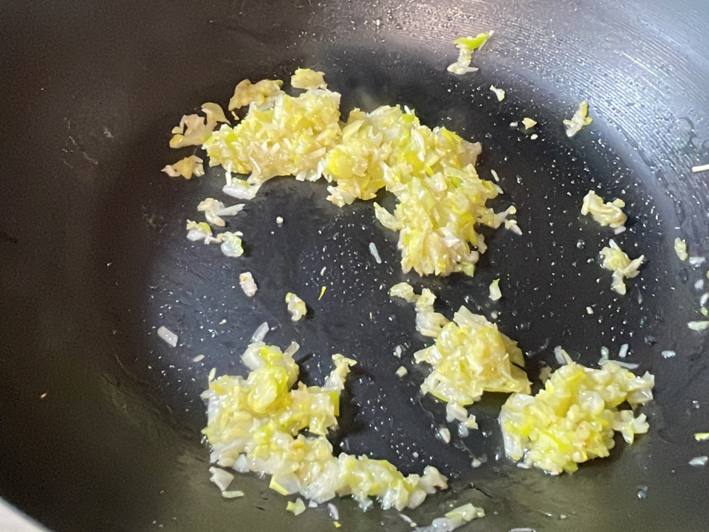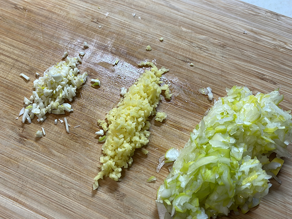 - 長ネギ、生姜、にんにくをみじん切りにします。