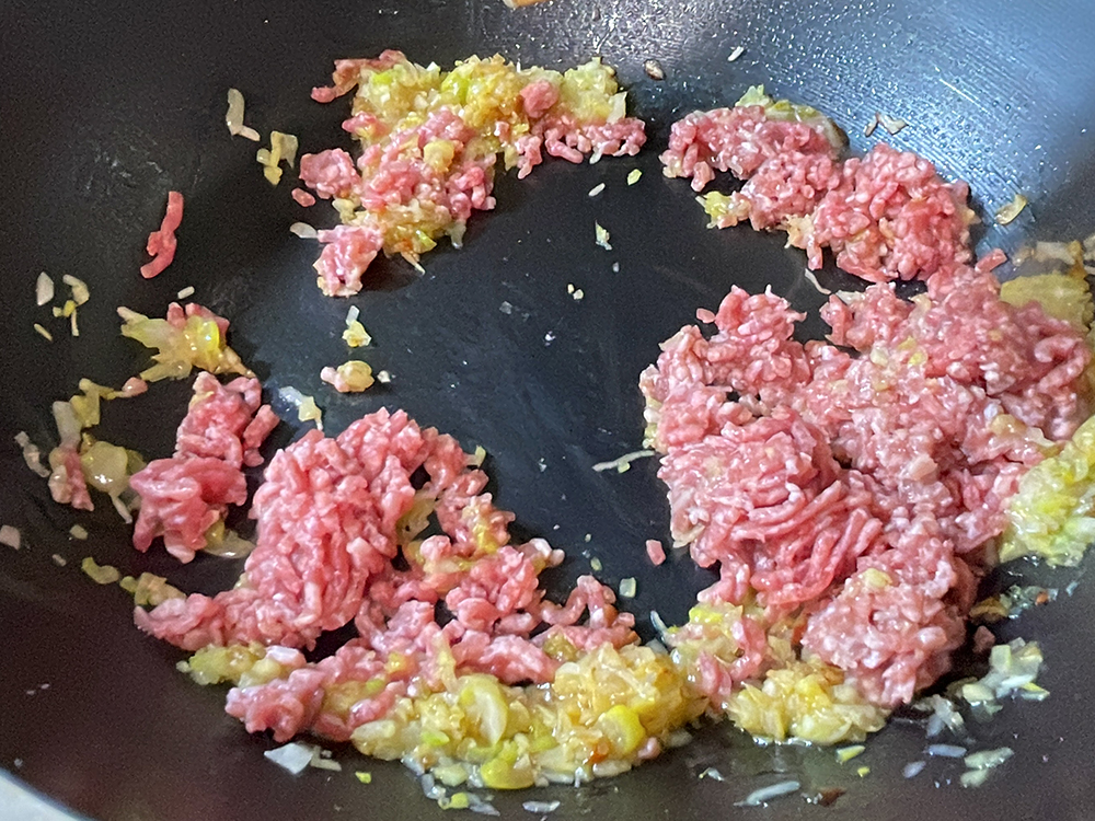 - へひき肉、甜麺醤を入れて火を入れます。