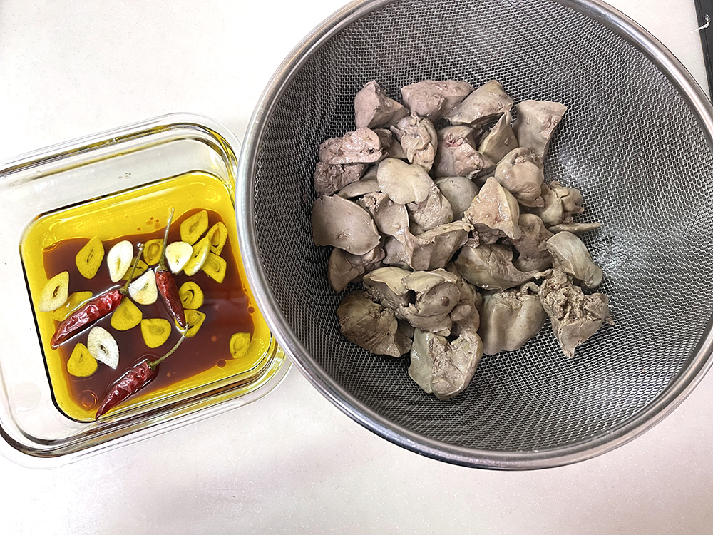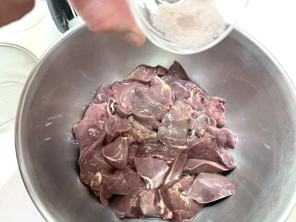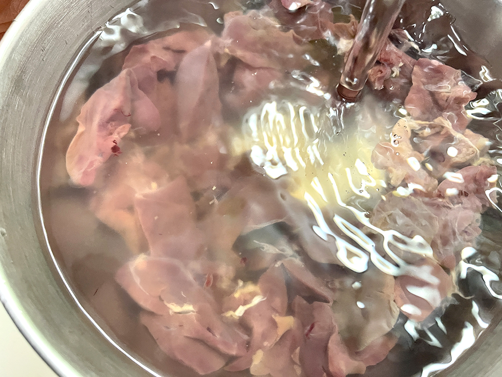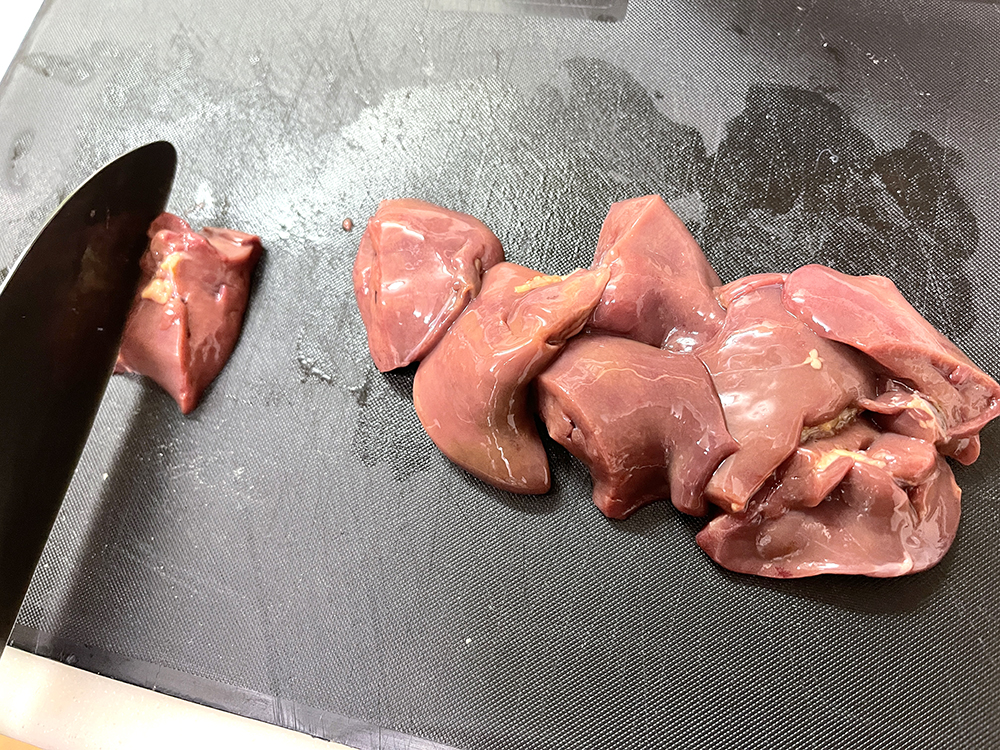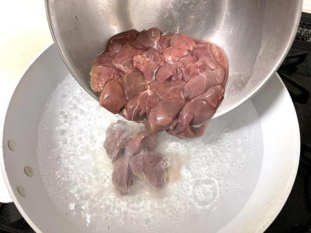 - 沸騰したお湯の中にレバーを入れ、完全に火が入ったらザルにとります。