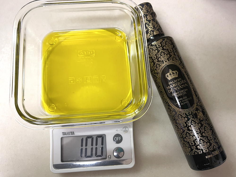 オリーブオイルを容器に入れた際に一緒に濃口醤油も入れます。追記しました。ご指摘ありがとうございます。