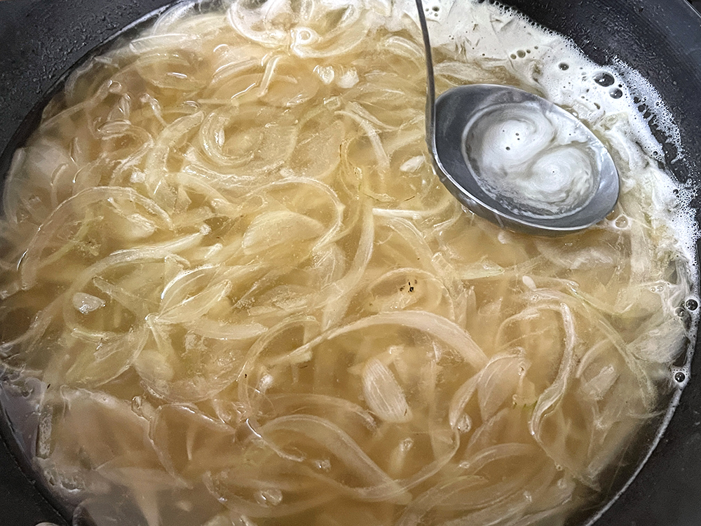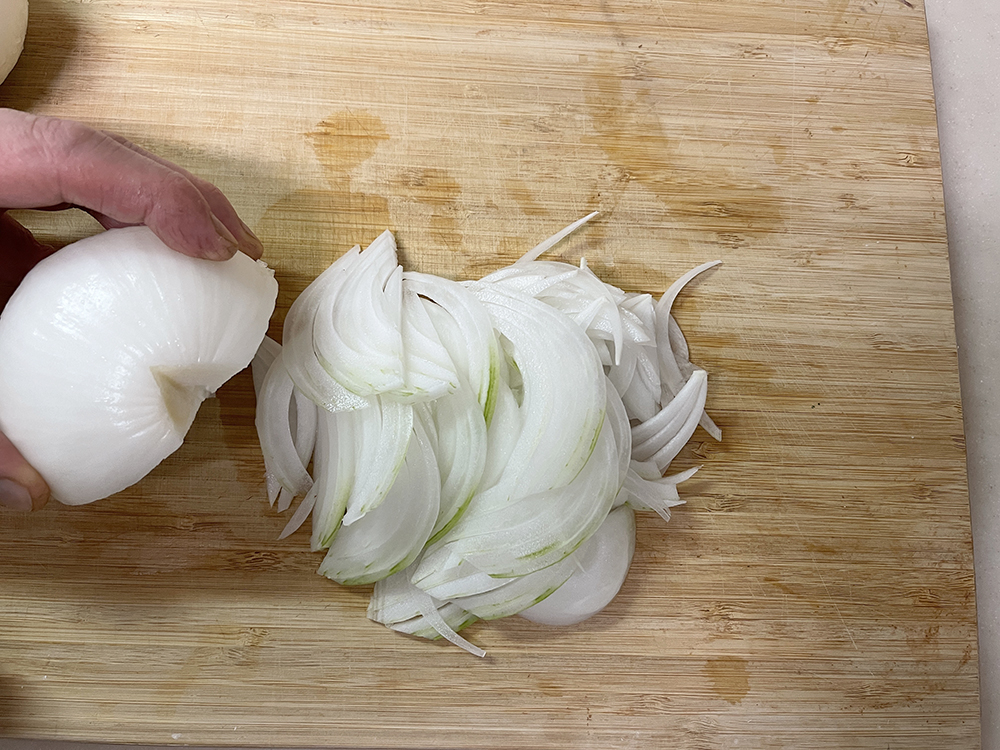 - 玉ねぎを半分に切り、薄くスライスします。(約400g)