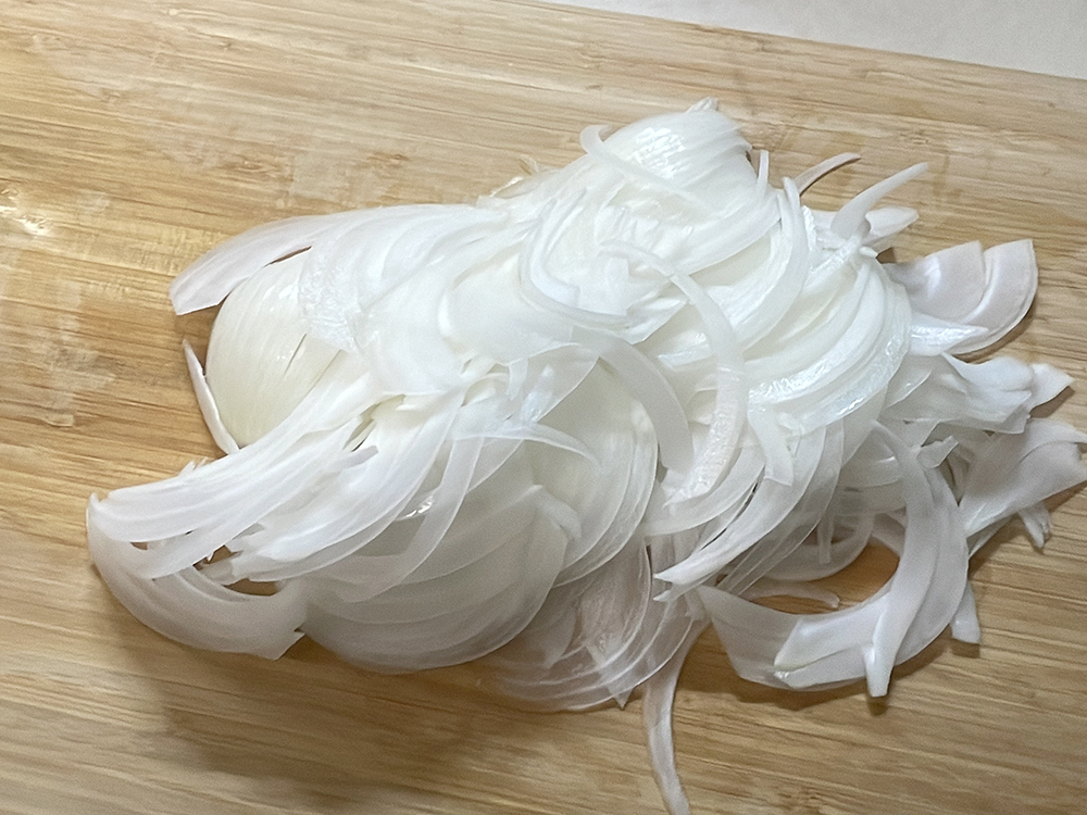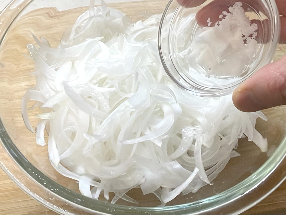 7. 玉ねぎのタイマーが鳴ったら、水洗いして塩分を抜き、玉ねぎをしっかり絞ります。