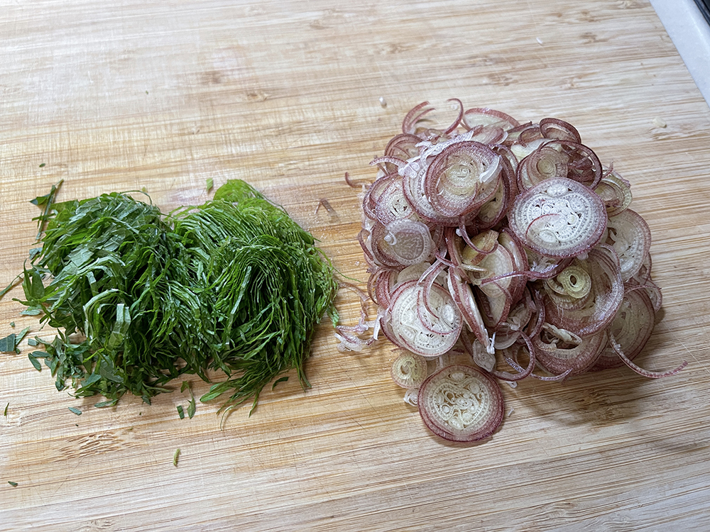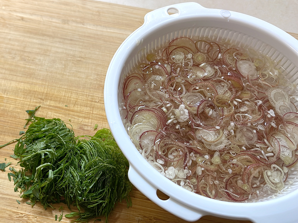 5. 茗荷を薄く小口切りにします。 大葉は千切りにします。