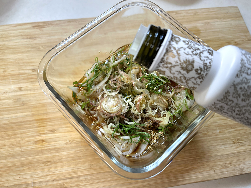 8. 漬ける容器に入れ、そばつゆ・茗荷・大葉・ごまを入れます。