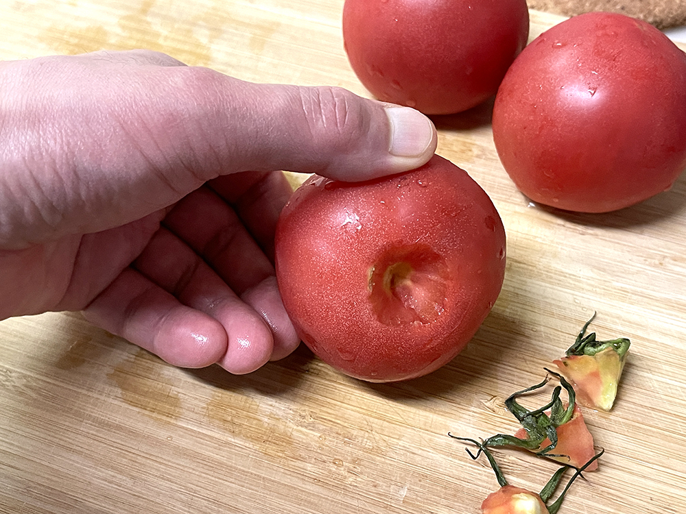 - トマトのヘタの部分を包丁の先で取ってきます。