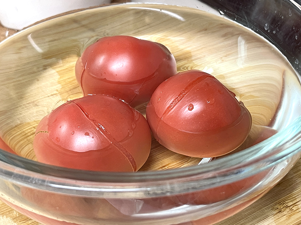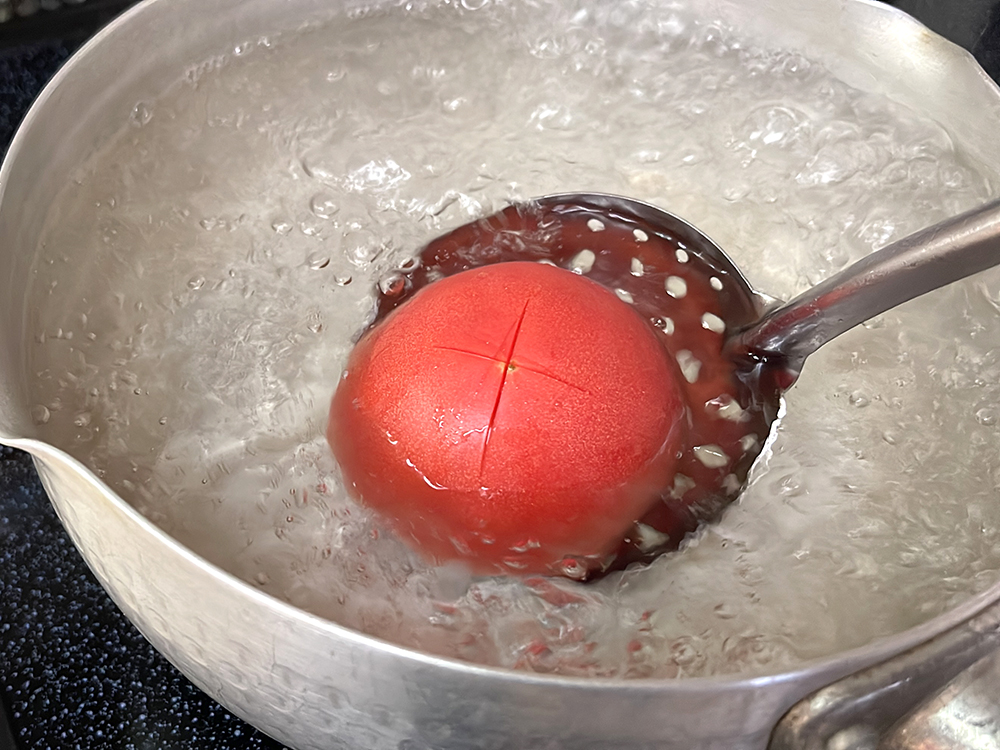 - 湯むきをしていきます。沸騰したお湯にトマトを入れ、10~15秒転がしながら満遍なく火を入れていきます。