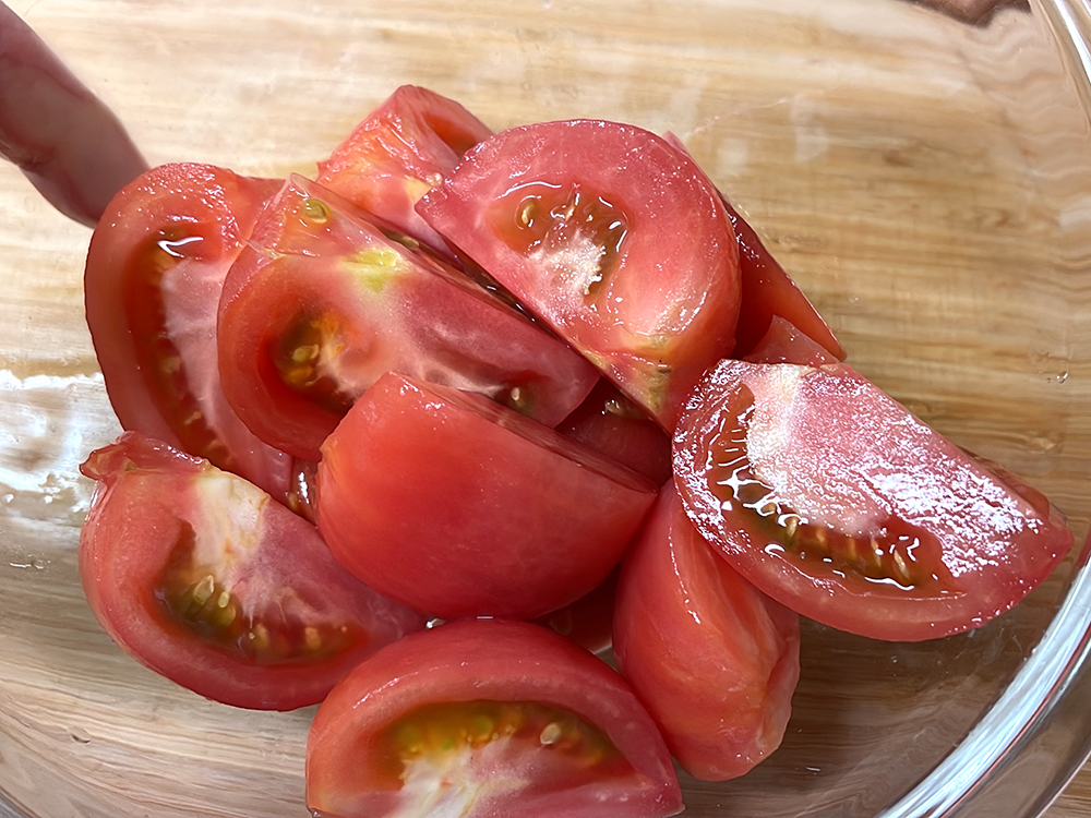 - トマトは4等分に切ります。
