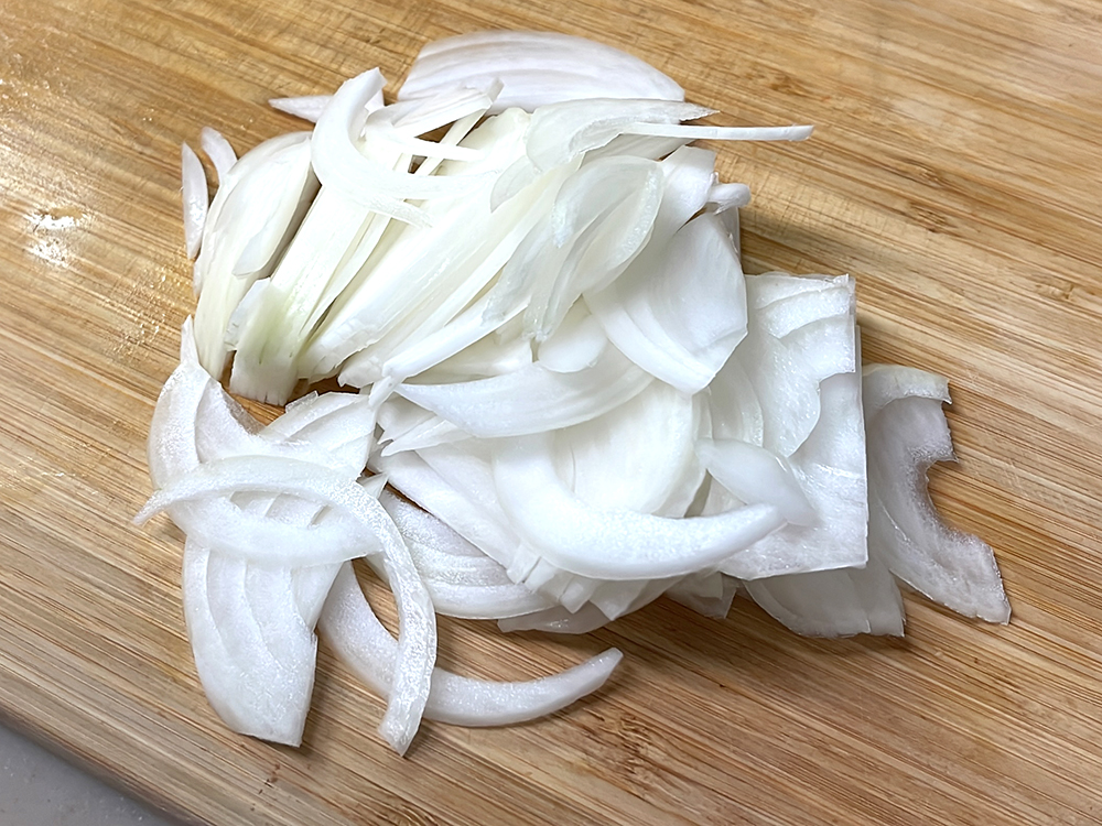 - 玉ねぎは薄くスライスします。
