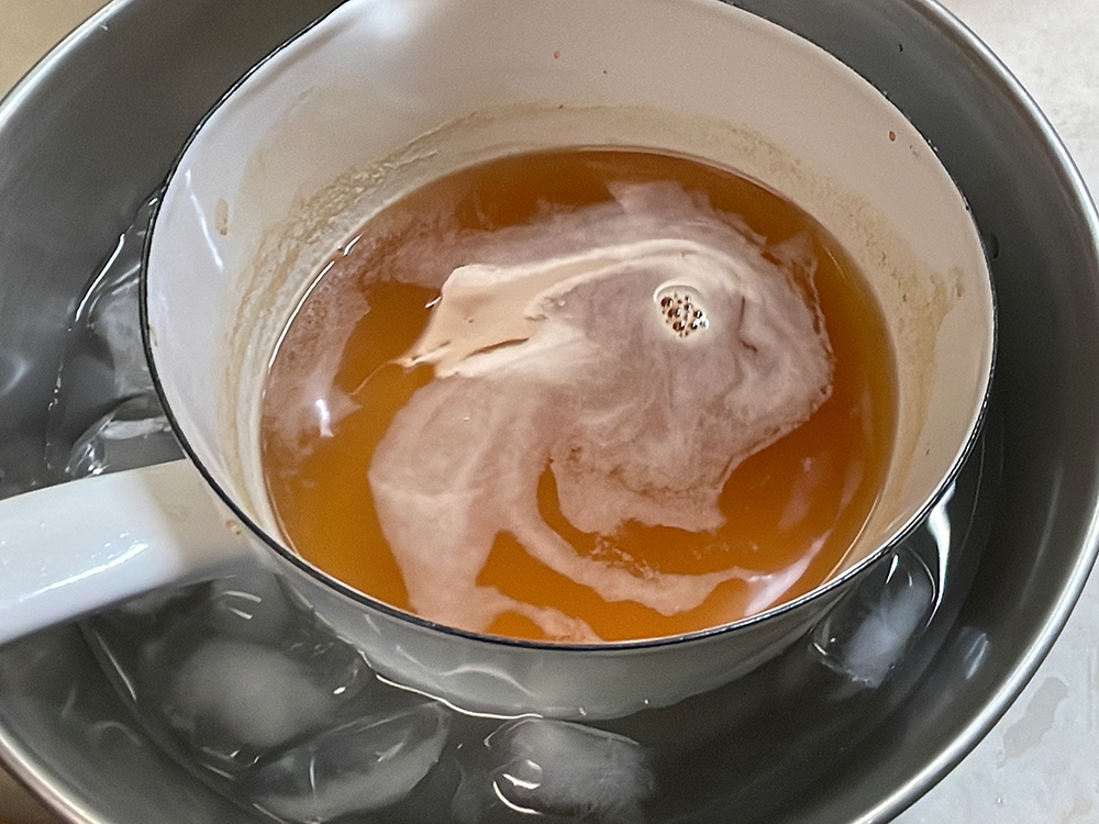 鍋に入れ火にかけ、一煮立ちしたら氷水に鍋をつけ急冷します。