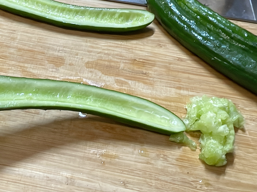 - きゅうりを板ずりして縦半分に切り、スプーンでタネを取ります。