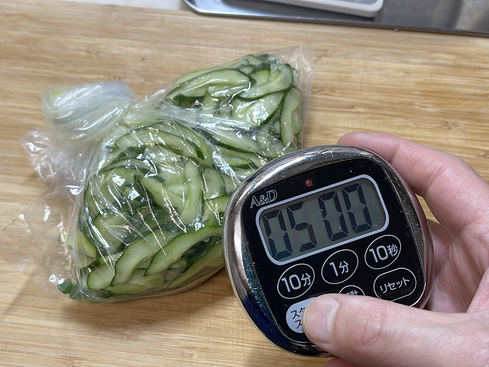 - ポリ袋にきゅうり・塩小さじ1を入れ、軽く揉んで5分置きます。しんなりしたら余分な水分を絞ります。
