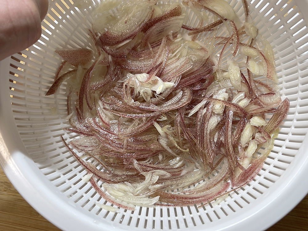 - 茗荷は縦半分に切り、軸を外してうすく斜めに切り水で洗います。