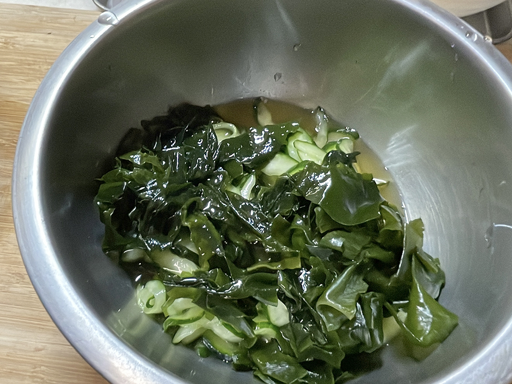 - ボウルにきゅうり、水気を切ったわかめを入れて土佐酢の半量で洗い、ザルにあげます。
