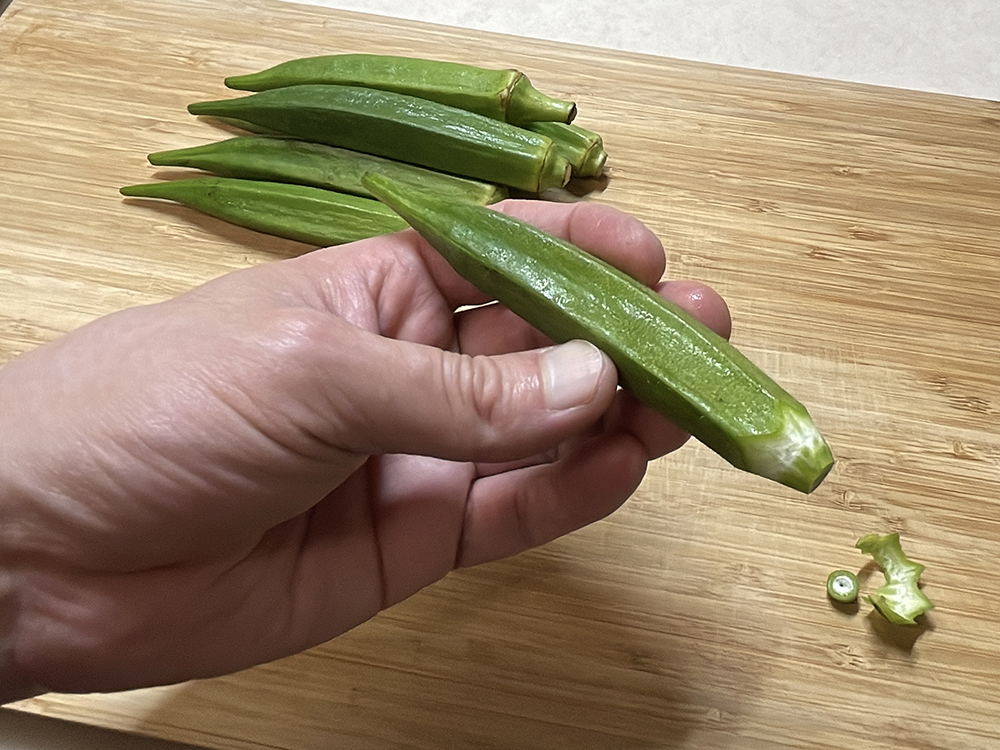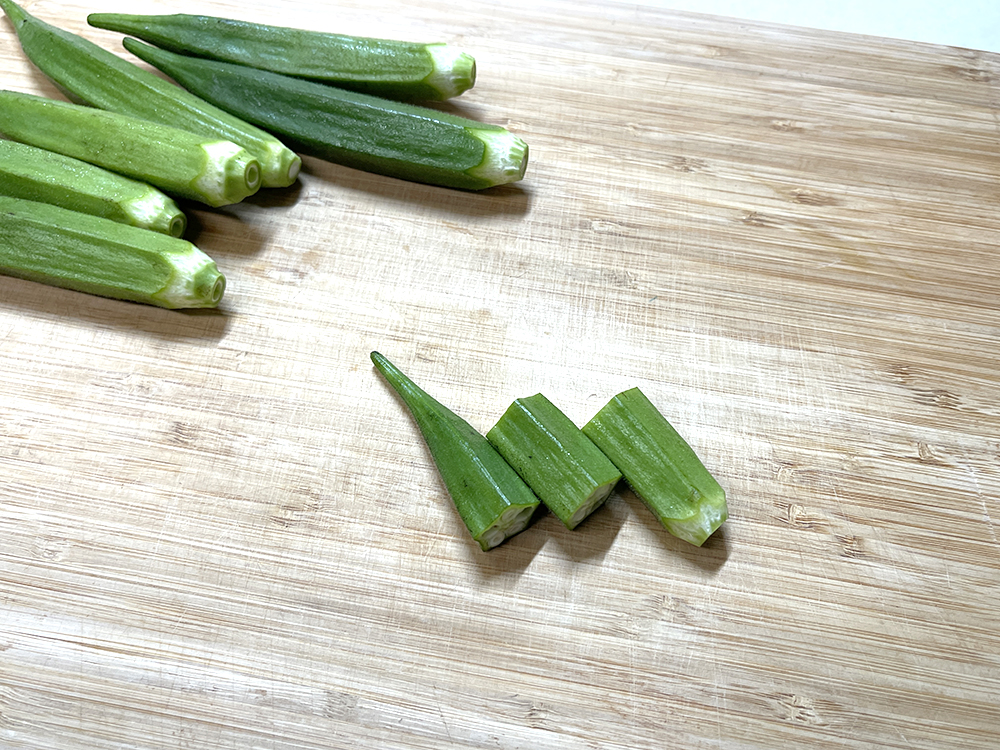 - オクラのヘタを切り、硬い部分も剥きます。