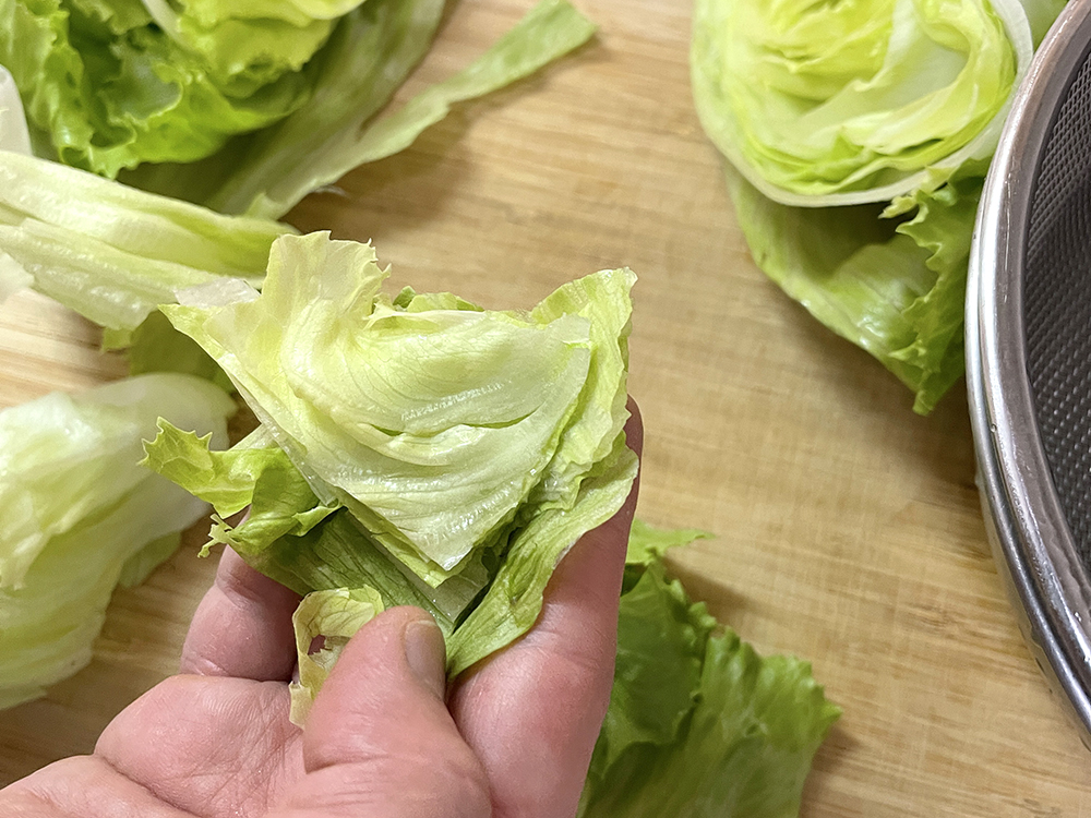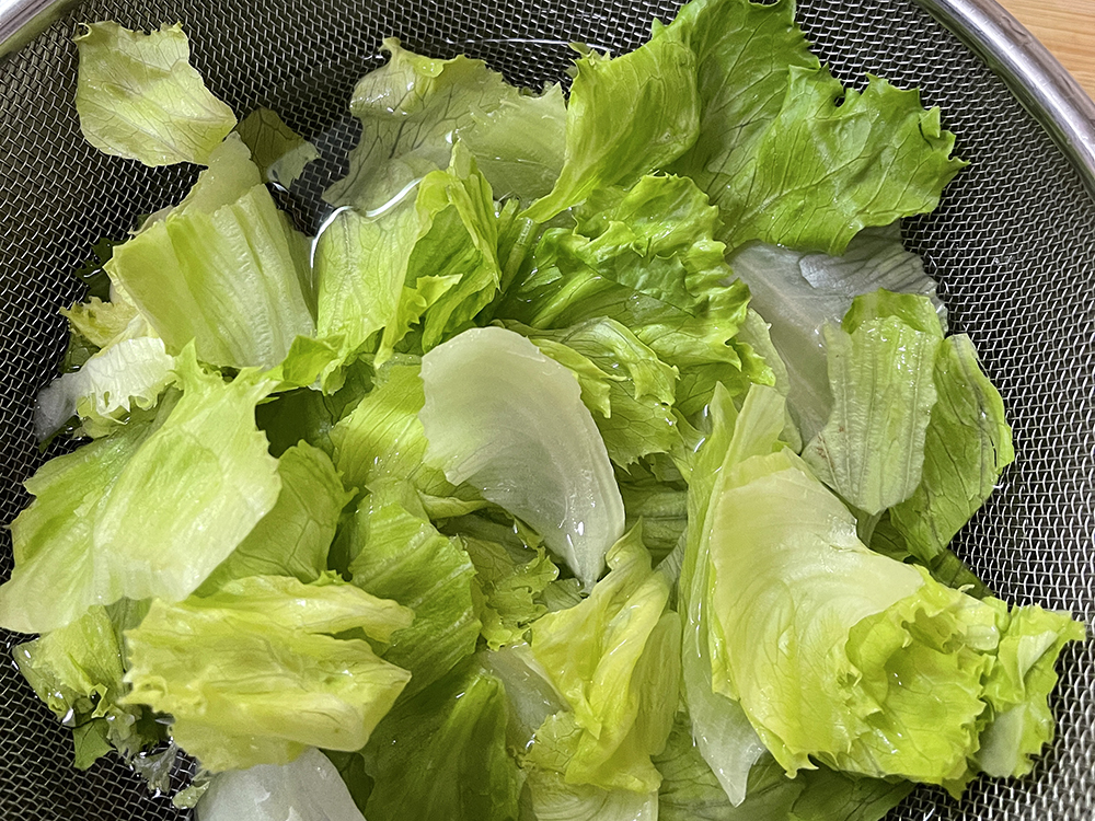 2. レタスを食べやすい大きさにちぎって洗う。