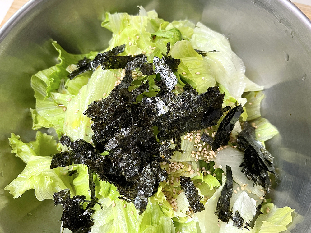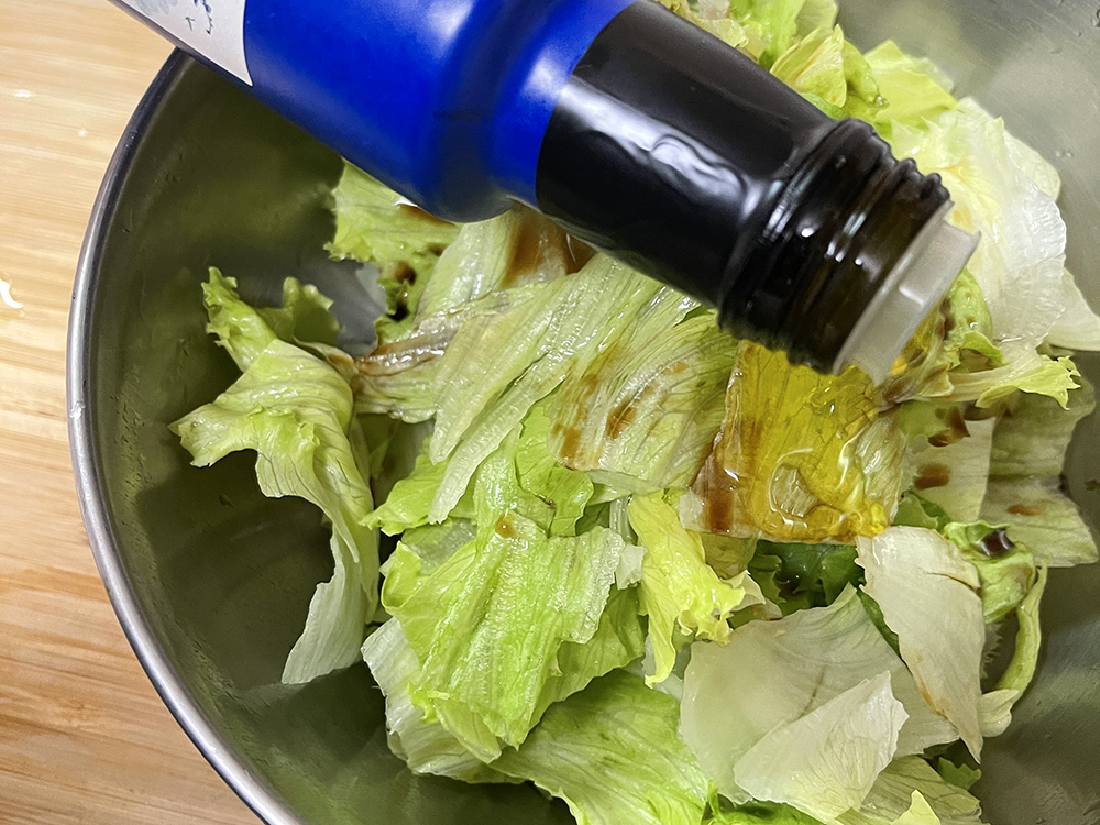 4. ボウルにレタスを移し、調味料Aを入れて混ぜる。